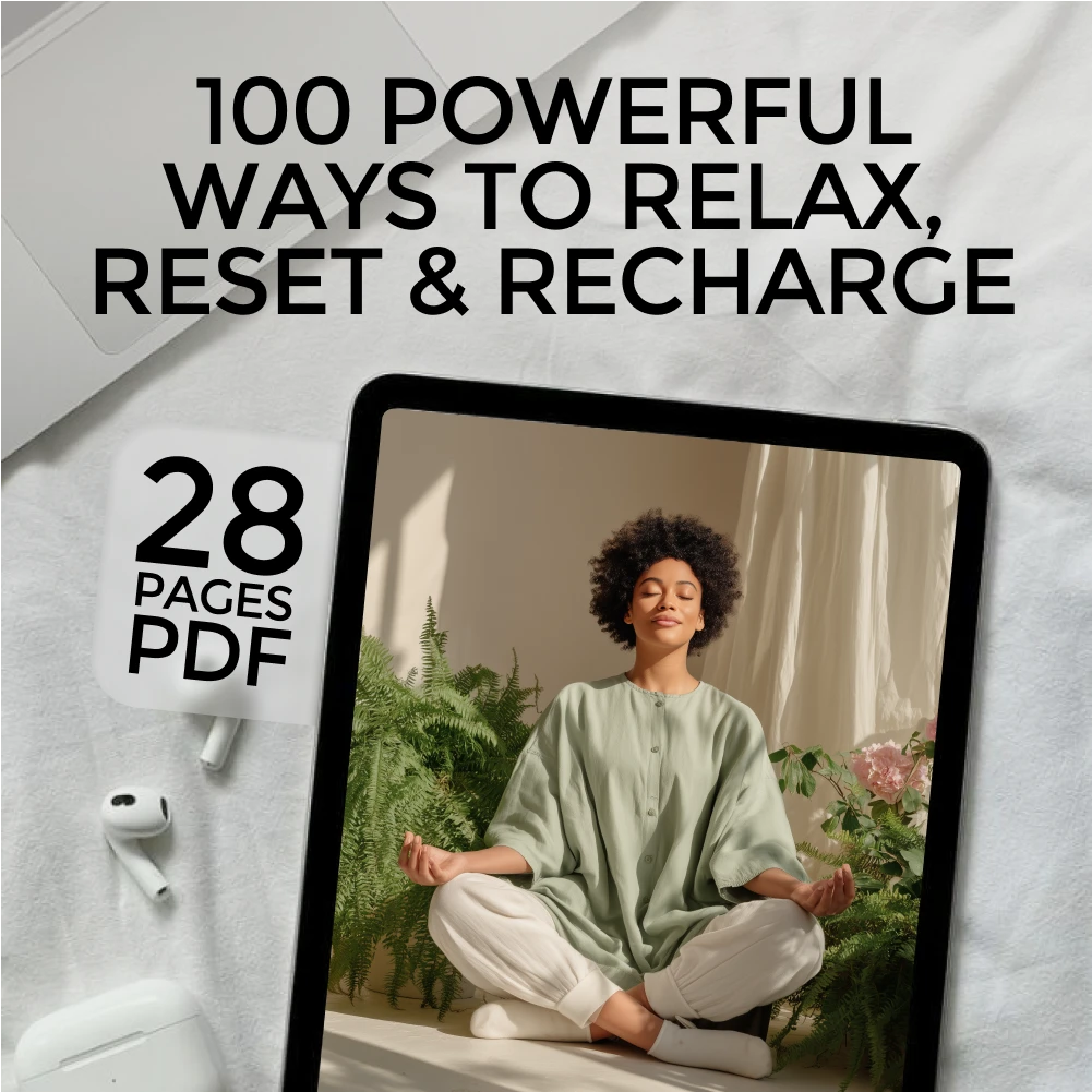 Ready to stop running on empty and start feeling like yourself again? Download your copy of 100 Powerful Ways to Relax, Reset & Recharge now and give yourself the permission—and tools—to pause, breathe, and feel better today.