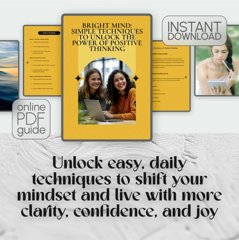 Why wait to feel better? Download “Bright Mind: Simple Techniques to Unlock the Power of Positive Thinking” today and start building the habits that lead to a more joyful, resilient you. Your journey toward positive thinking starts here—one page at a time.