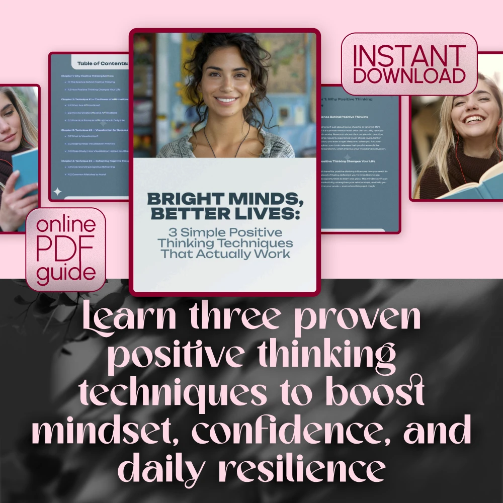 Ready to shift your mindset and improve your everyday life? Bright Minds, Better Lives: 3 Simple Positive Thinking Techniques That Actually Work is your empowering digital guide to discovering how just three powerful habits can reshape your thoughts—and your future. Whether you’re overwhelmed by stress, stuck in negative self-talk, or simply seeking more mental clarity, this easy-to-follow resource helps you take control using proven strategies. These 3 great positive thinking techniques are backed by science, crafted for simplicity, and designed to create real change.