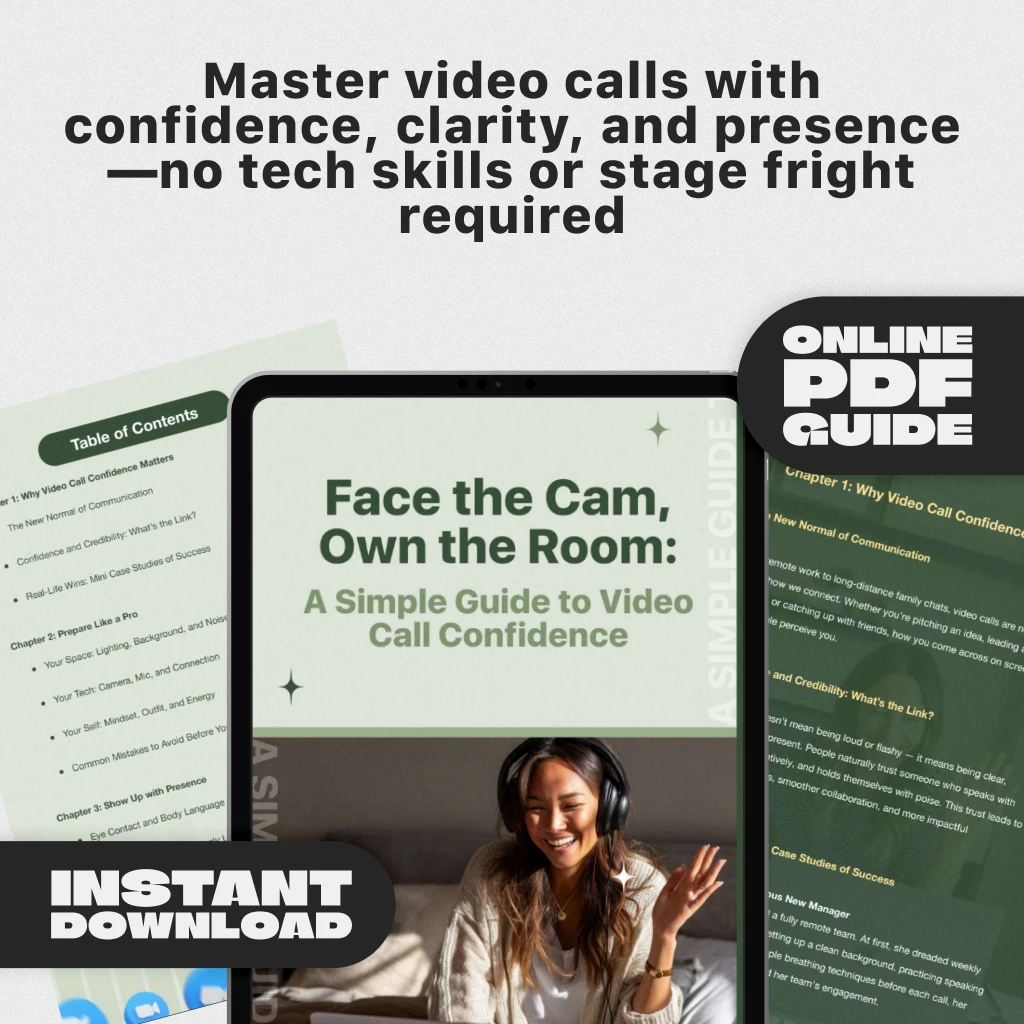 Ready to stop dreading Zoom calls and start leading them with confidence? Download Face the Cam, Own the Room: A Simple Guide to Video Call Confidence today and learn how to be confident on video call in just a few easy steps. Whether it’s your first call or your hundredth, this guide will help you show up, speak up, and stand out—on screen and off.