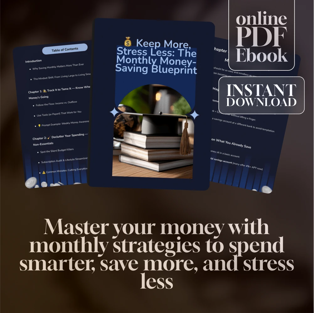 Ready to stop wondering where your money goes and start keeping more of it instead? Keep More, Stress Less: The Monthly Money-Saving Blueprint is your go-to digital guide for building smarter financial habits, trimming wasteful spending, and saving money every single month—without feeling deprived. Whether you’re just starting your money-saving journey or looking to fine-tune your budget, this downloadable eBook will give you clear, actionable steps to take control of your finances for good.