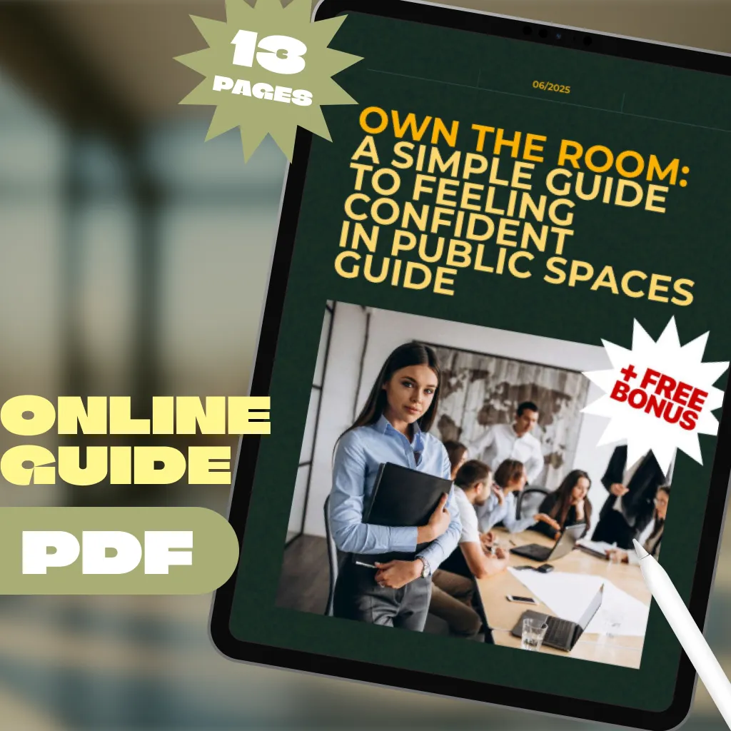 Download “Own the Room: A Simple Guide to Feeling Confident in Public Spaces” today and discover how to be confident in public places without pretending to be someone you’re not. Feel empowered, speak clearly, and finally walk into any space like you belong there—because you do.