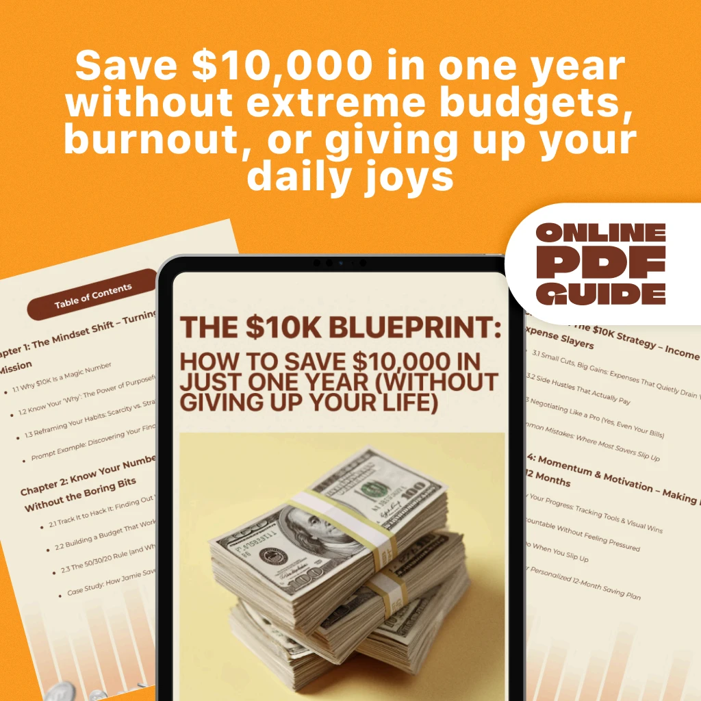 Ready to stop guessing and start saving? Download The $10K Blueprint: How to Save $10,000 in Just One Year (Without Giving Up Your Life) now and take your first confident step toward a financially freer future. It’s not just a guide—it’s your plan, your strategy, your year. Don’t wait. Your $10K starts here.
