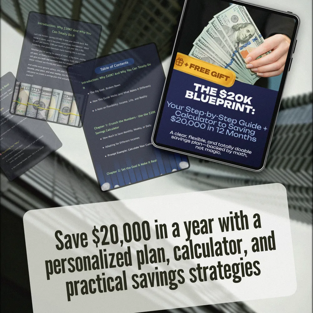Ready to finally save $20,000 but don’t know where to start? The $20K Blueprint: Your Step-by-Step Guide + Calculator to Saving $20,000 in 12 Months is the ultimate digital ebook designed to make your savings goal achievable and even enjoyable. This guide breaks down the daunting target into manageable steps, combined with an easy-to-use how to save $20000 in a year calculator so you can customize your plan based on your income and lifestyle. Whether you’re saving for an emergency fund, debt freedom, or a major purchase, this comprehensive ebook guides you every step of the way.