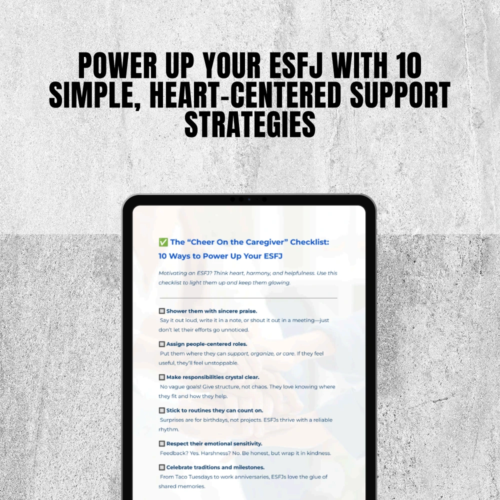 Whether you’re building a better workplace, growing a relationship, or simply showing your ESFJ how much they matter, this checklist will help you do it with intention and heart. Click “Add to Cart” and download your copy of The “Cheer On the Caregiver” Checklist: 10 Ways to Power Up Your ESFJ now—because when they feel seen, they shine.