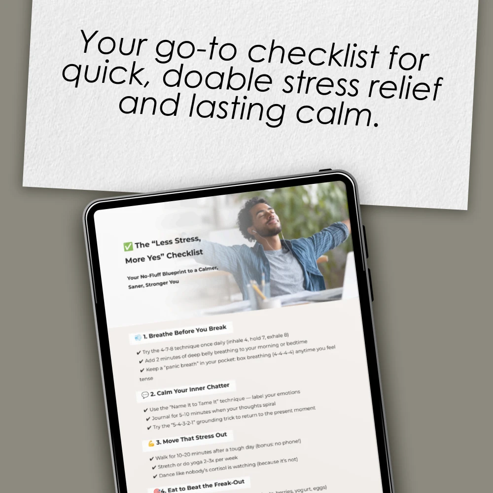 Instead of overwhelming advice or complicated routines, this checklist gives you quick, easy wins to help you breathe deeper, think clearer, and stress less — all without having to read a whole book or commit to a major lifestyle overhaul. Say yes to calm, one doable action at a time.