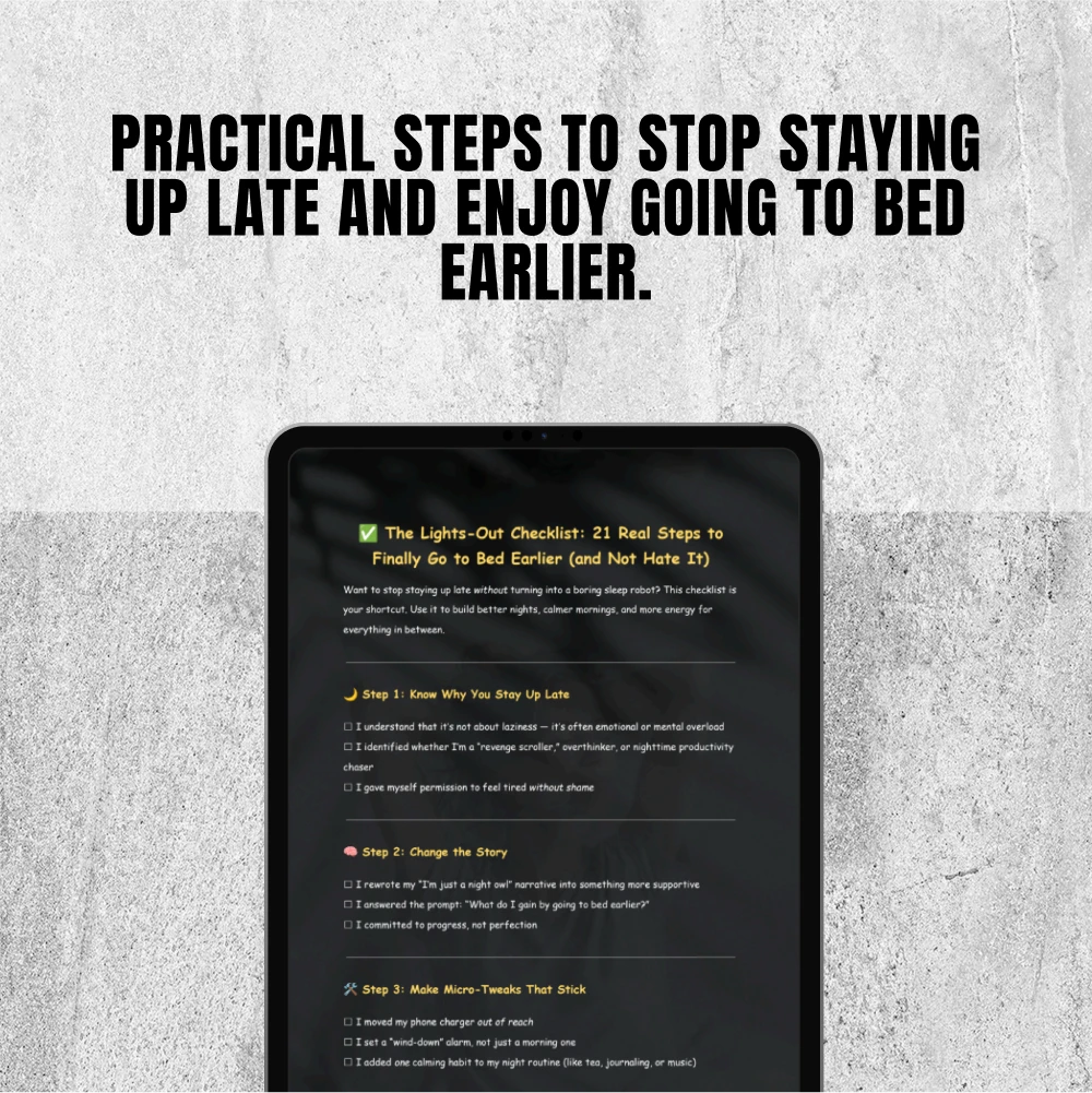 Don’t let another restless night steal your energy and peace. Download The Lights-Out Checklist: 21 Real Steps to Finally Go to Bed Earlier (and Not Hate It) now and start your journey toward better sleep. It’s time to learn how to stop staying up late, gently change your habits, and finally enjoy the bedtime you deserve. Your best rest is just a checklist away.