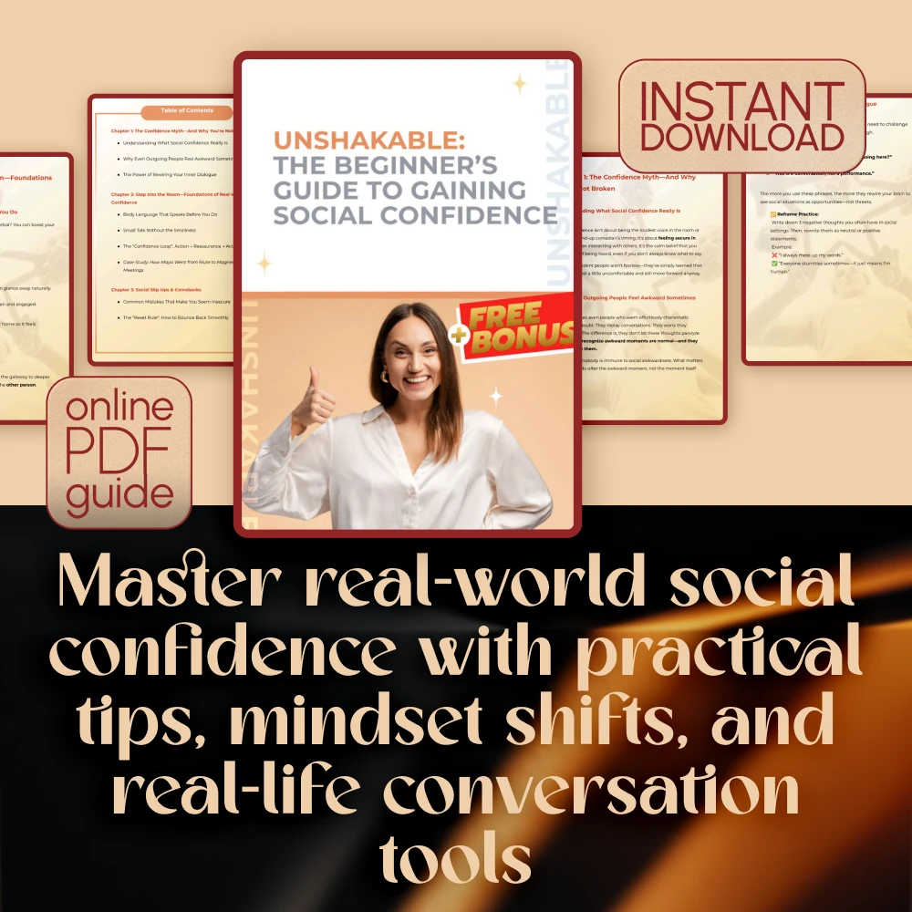 Do you walk into a room and instantly second-guess yourself? Wish you could speak up without overthinking every word? Unshakable: The Beginner’s Guide to Gaining Social Confidence is your no-fluff, beginner-friendly blueprint for navigating conversations, group settings, and awkward moments with confidence. Whether you’re tired of shrinking back in meetings or struggling to connect at social events, this instantly downloadable guide shows you exactly how to gain social confidence—without pretending to be someone you’re not.