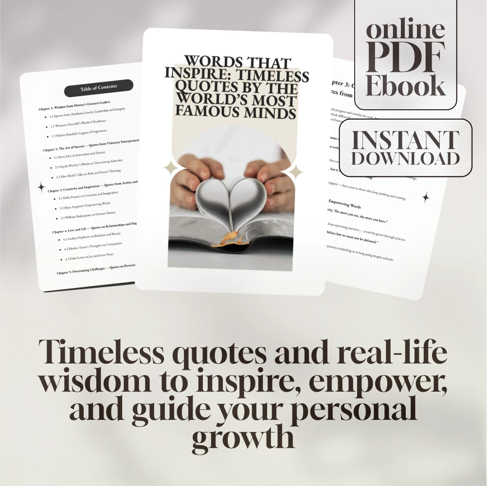 Discover the wisdom of the ages with Words That Inspire: Timeless Quotes by the World’s Most Famous Minds — an inspiring digital download eBook that brings together the most powerful and motivational words ever spoken. Curated from history’s most respected leaders, visionary entrepreneurs, iconic artists, and humanitarians, this guide is more than just a collection of quotes — it’s a roadmap to a more intentional, courageous, and purpose-driven life. Whether you’re seeking a spark of creativity, a boost in resilience, or a new perspective on love and life, this resource puts timeless wisdom at your fingertips.