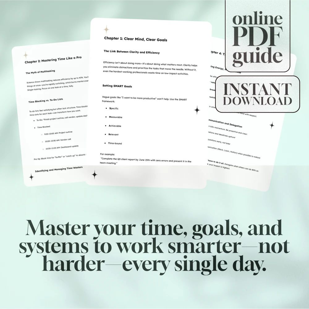Whether you’re overwhelmed by your to-do list or simply want to work more effectively, this downloadable guide shows you exactly how to become more efficient at work, one practical step at a time. Packed with clear explanations, real-life case studies, and hands-on exercises, this digital resource will transform how you manage your time, energy, and tasks.
